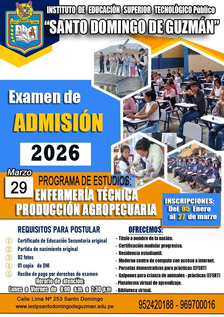 El 29 de marzo los postulante de los Programas de Estudio de Producción Agropecuaria y Enfermería Técnica rendirán el EXAMEN DE ADMISION, a hora (10:00 a.m). Los Postulantes que llegarán tarde o no se presentarán, NO habrá nueva fecha, para el Examen, ni tendrán derecho a ningún reclamo.